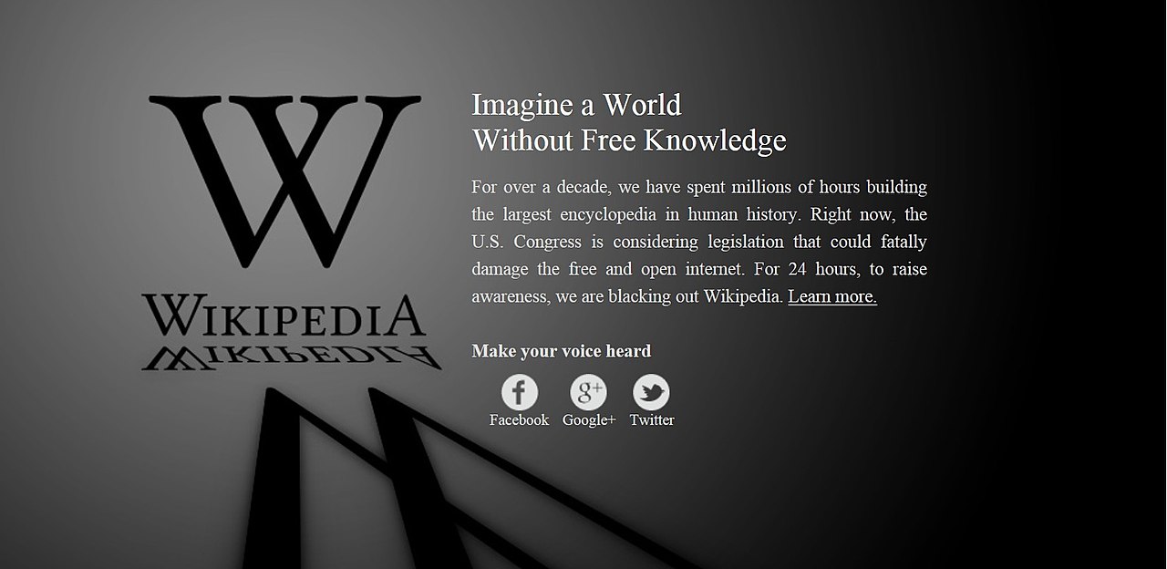 Le 18 janvier 2012, plus de 115 000 sites ont décidé de « s’éteindre » ou d’afficher des messages de protestation pendant 24 heures.