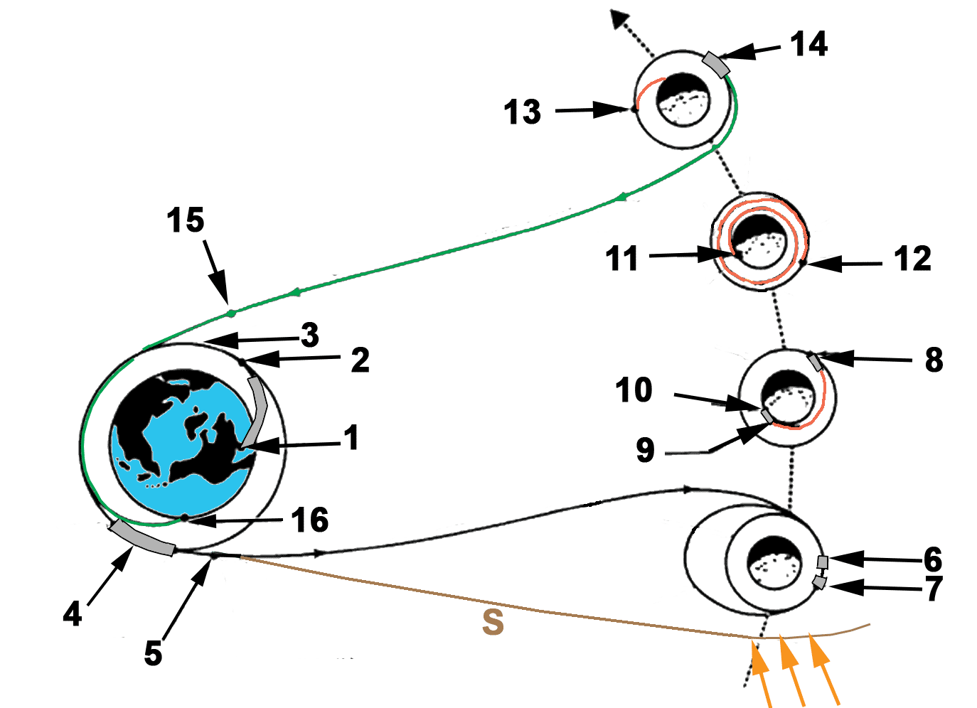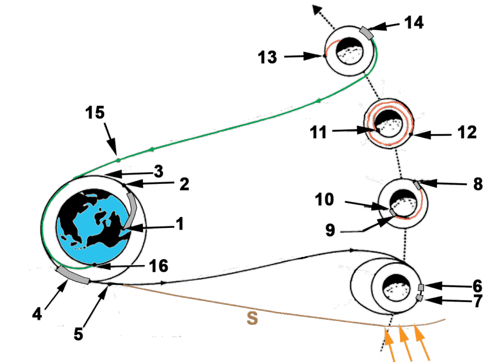 13 Largage du module lunaire – 14 Injection sur orbite de retour