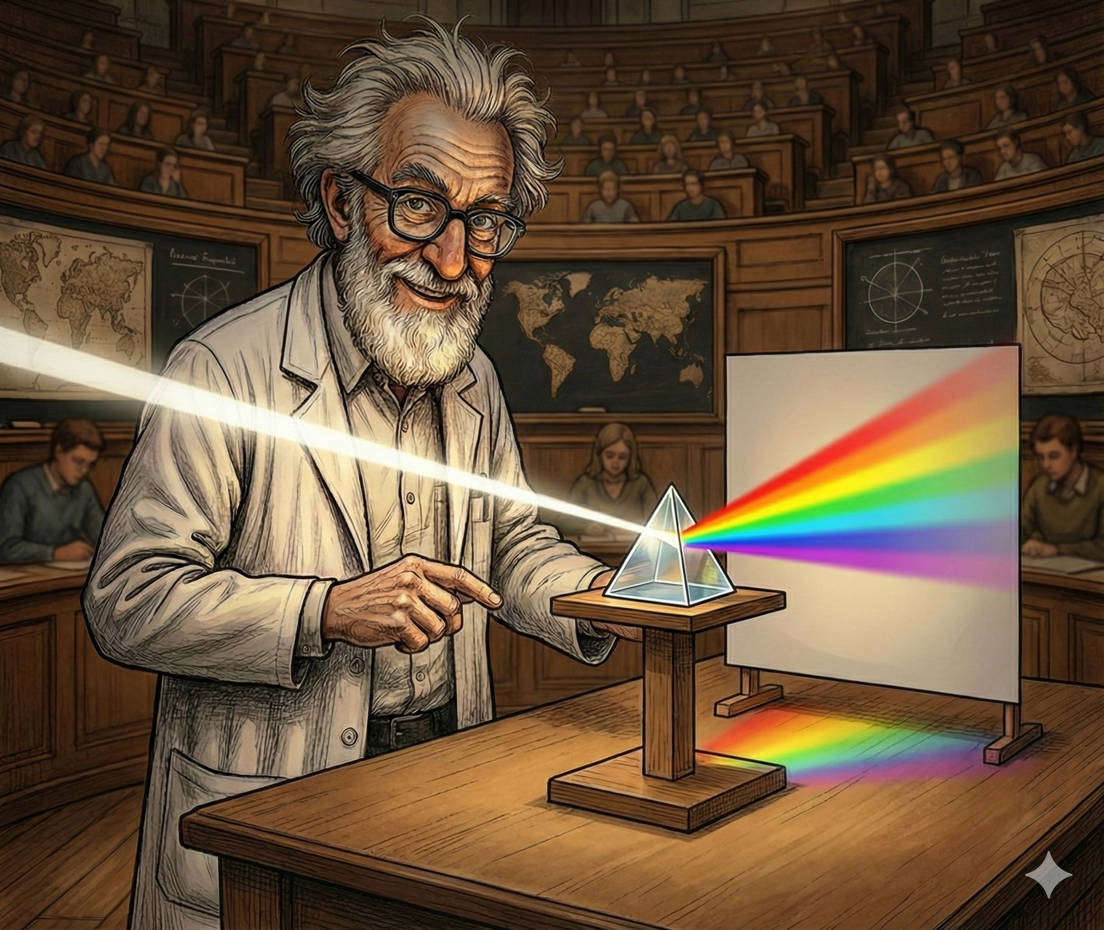Mais Newton ne s’arrête pas au “wahou”. Il veut savoir qui fait quoi. Alors il isole une seule couleur, puis la renvoie dans un second prisme. Et là, surprise : la couleur ne se transforme pas, elle reste elle‑même. Puis il fait l’inverse : il prend tout le spectre, le recombine avec un deuxième prisme correctement orienté, et il récupère une lumière blanche. Conclusion implacable : le prisme ne crée pas les couleurs, il les sépare. La lumière blanche est déjà un mélange, un cocktail de “notes” différentes, et le prisme agit comme un filtre qui les étale au grand jour.